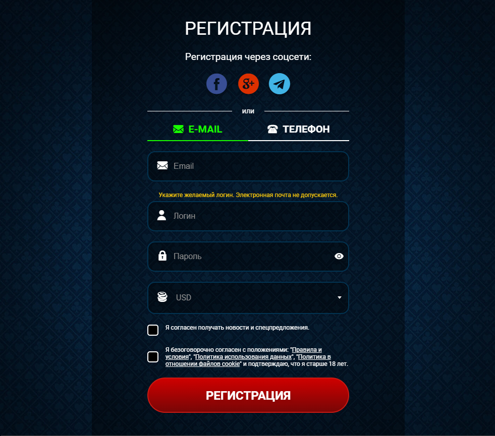 Прежде, чем начать игру на реальные деньги, пользователю нужно пройти регистрацию. Она упрощена, и занимает не более 5 минут. По закону, в азартные заведения могут допускаться только совершеннолетние лица. Если вы не достигли этого возраста, то при рассмотрении документов, будет получен отказ. Для создания аккаунта потребуется телефон и электронная почта. Процесс делится на этапы: